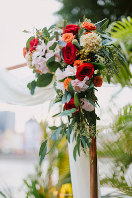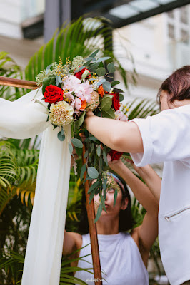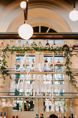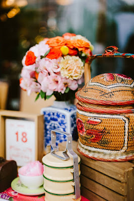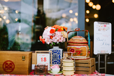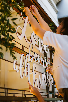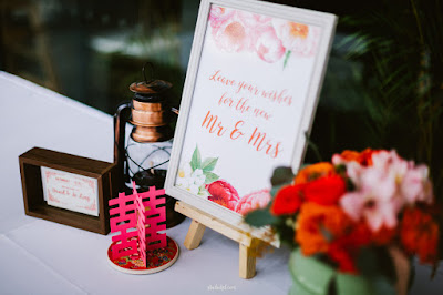 Our exclusive wedding stylist Pei Li from 8 Dec decorated the reception, guest book & photo album table with Peranakan props like Tingkat, wooden antique ang bao box, bakul Siah (a peranakan "kueh"/cake basket that was used to deliver cakes to family), blue & white porcelain vase, etc and Shu min our exclusive florist from Meadows & Clouds complemented the decors with unique flowers in line with the theme. They also did one of the largest cutout wordings they've created so far measuring a whopping 1.2m x 1.6m with the tagline "Love Bears All Things" hanging from the shelf behind the bar counter as our backdrop. They did a wonderful job and everyone loves the whole look and feel even the wedding copper frame arch for our Solemnisation.